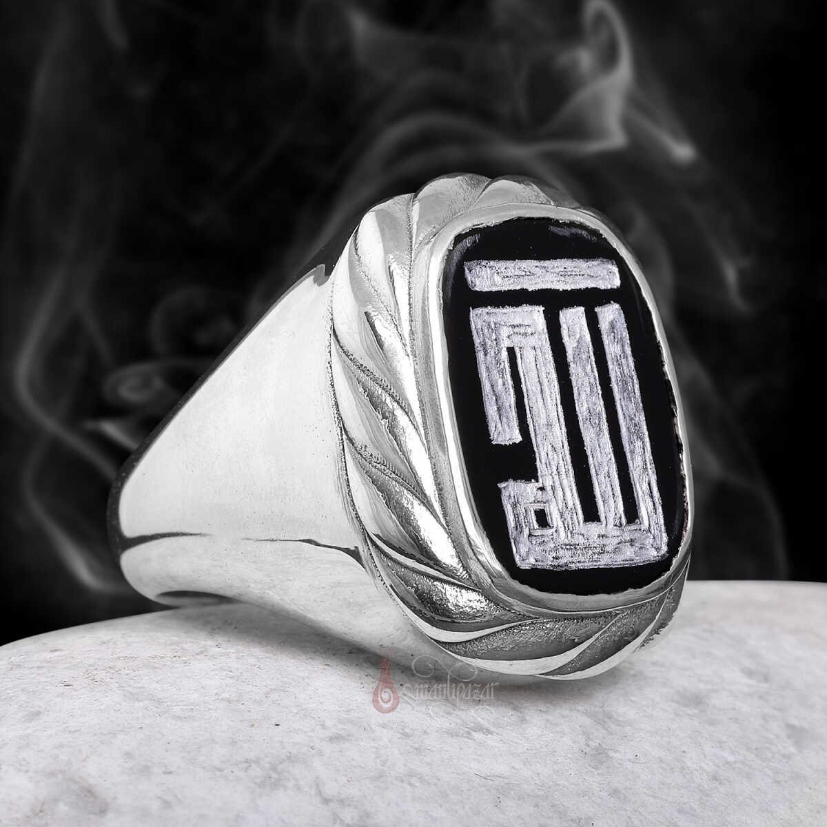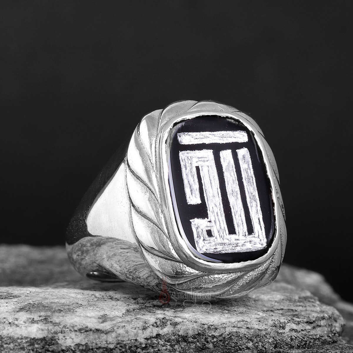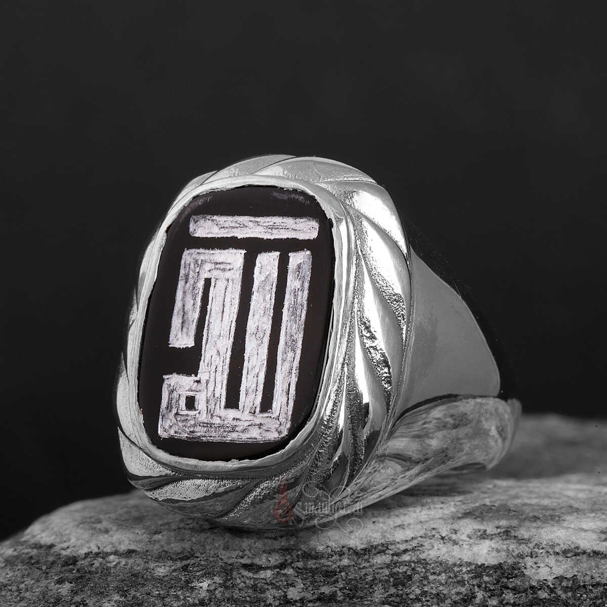 Bu özel tasarım yüzükte, İslam sanatının en etkileyici yazı biçimlerinden biri olan Küfi hat ile “Allah” lafzı, siyahın asaletiyle özdeşleşen doğal oniks taşının kalbine işlenmiştir.