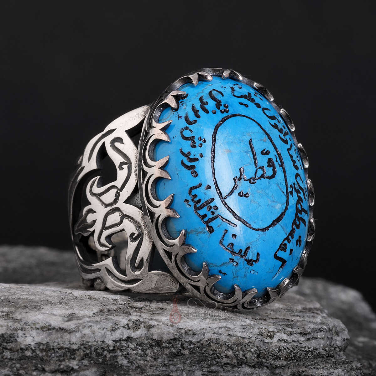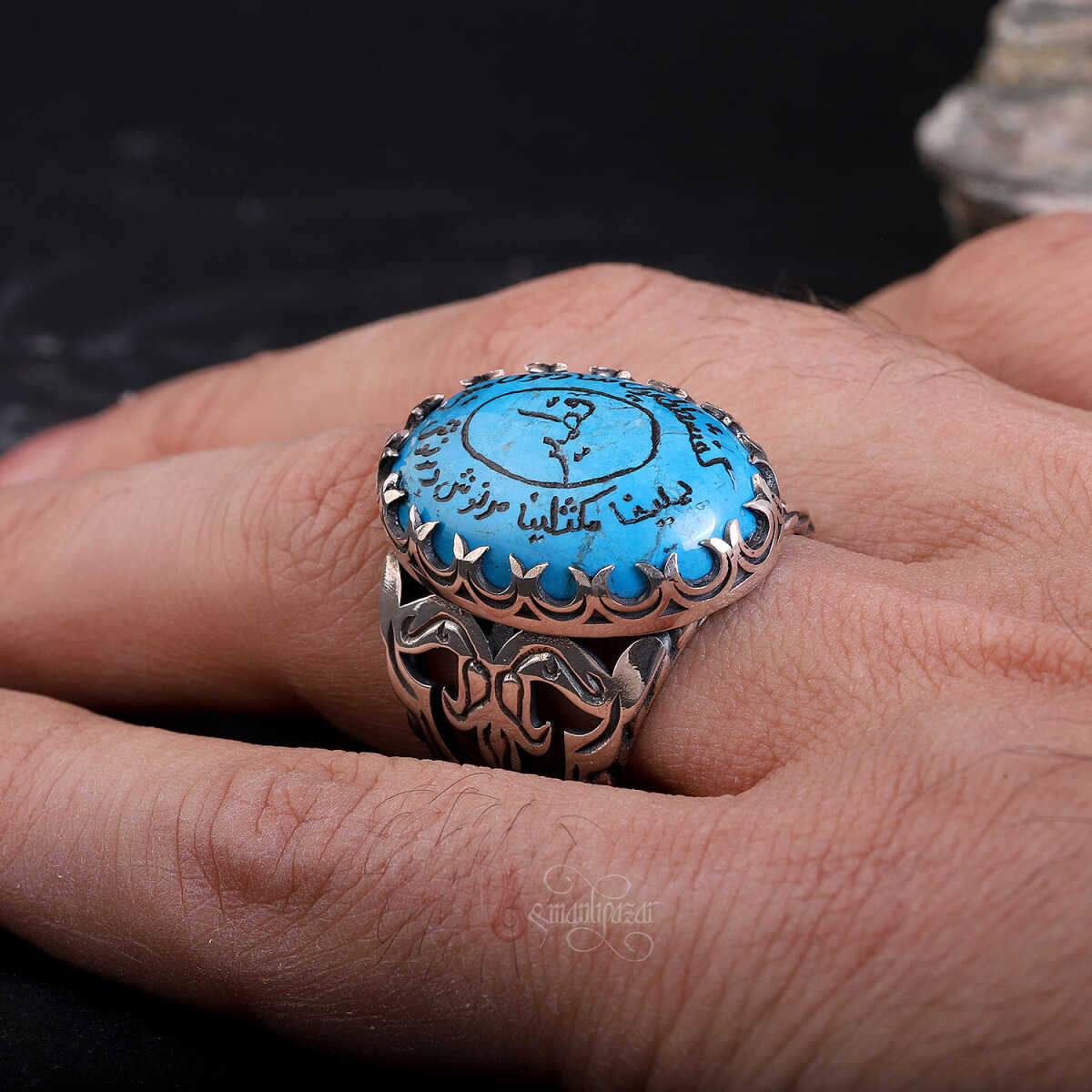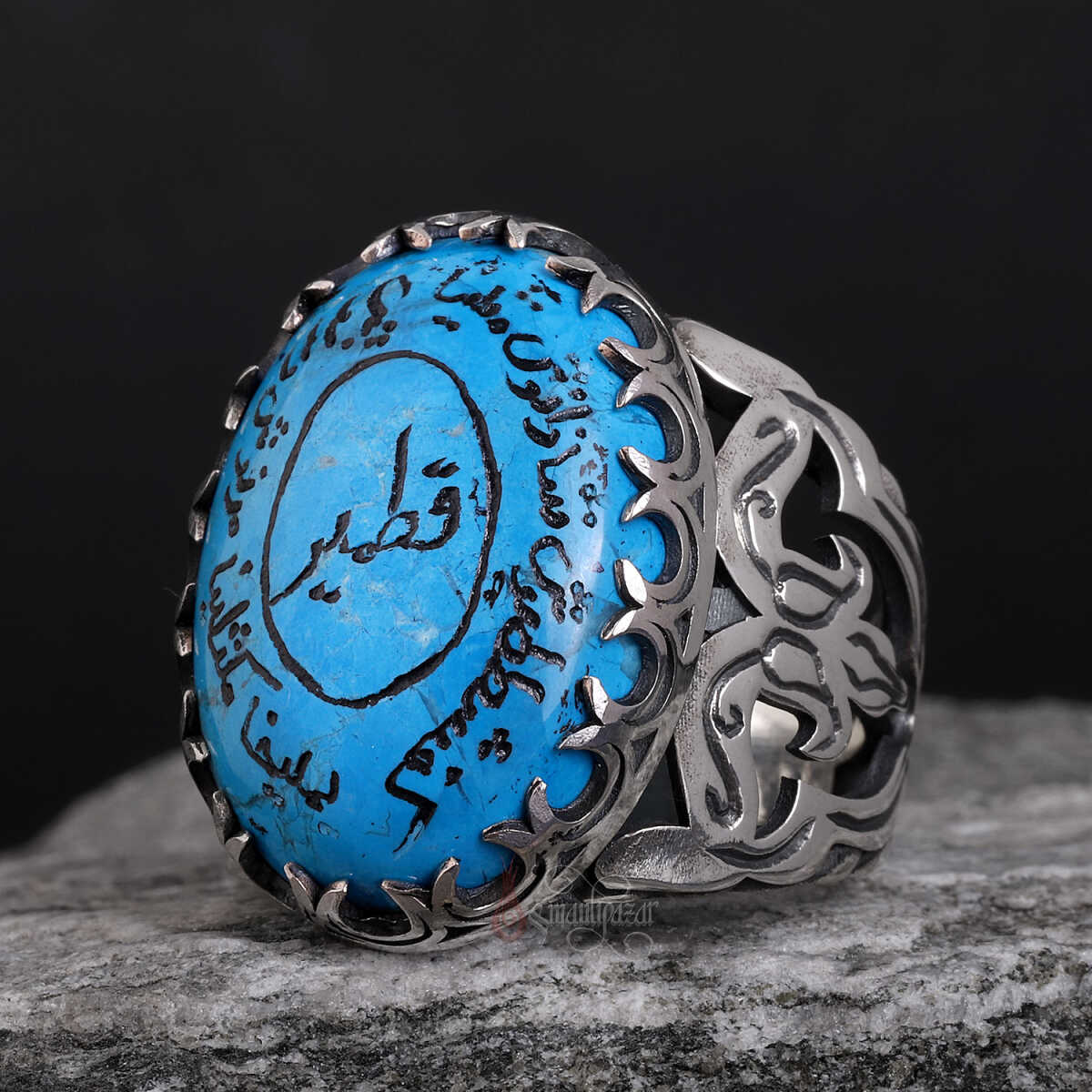 Firuze taşının üzerindeki yazı, modern lazerle değil, usta ellerin geleneksel el yazması tekniğiyle işlenmiştir.