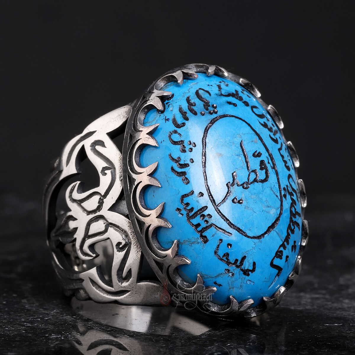 Yüzüğün merkezinde yer alan mavi firuze taşı üzerine el işçiliğiyle yazılmış Ashab-ı Kehf duası, gümüş gövdeye Osmanlı stilinde işlenen kalem işi motiflerle çevrelenmiştir.