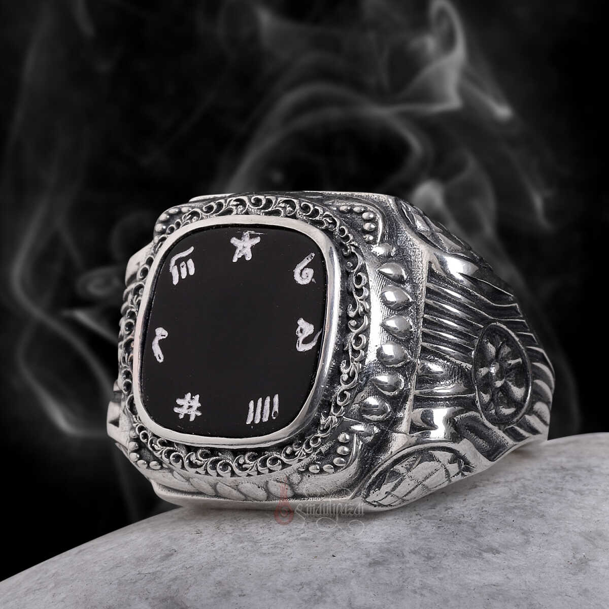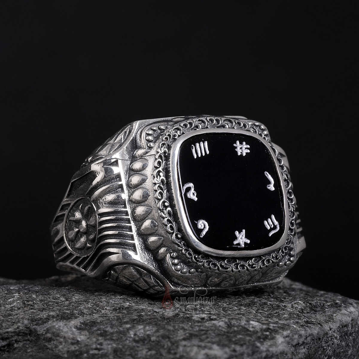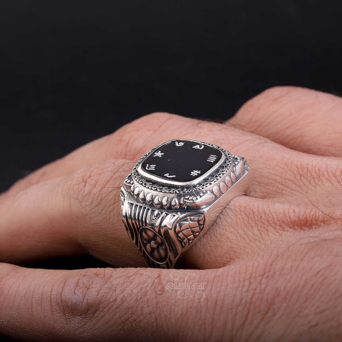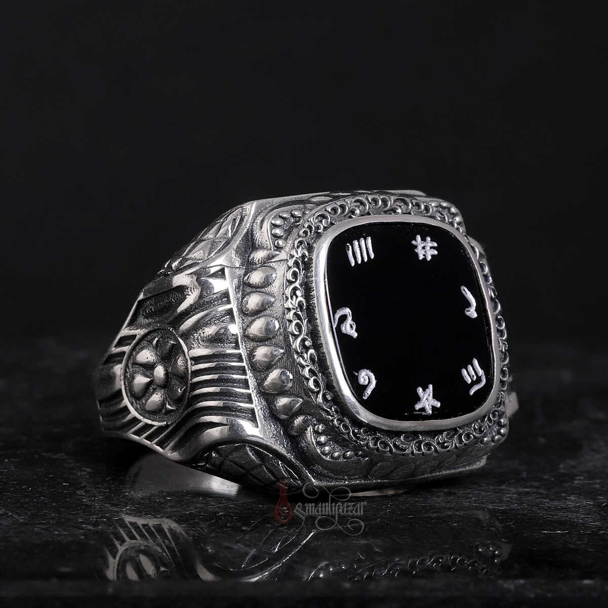 İsm-i Âzam yazılı siyah oniks taşlı el işçiliği gümüş yüzük; koruyucu enerjisi, güçlü manevi anlamı ve usta zanaatkârlığın birleşimiyle hem şıklık hem de ruhani derinlik sunan özel bir aksesuardır.