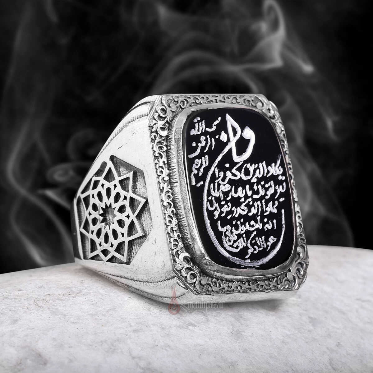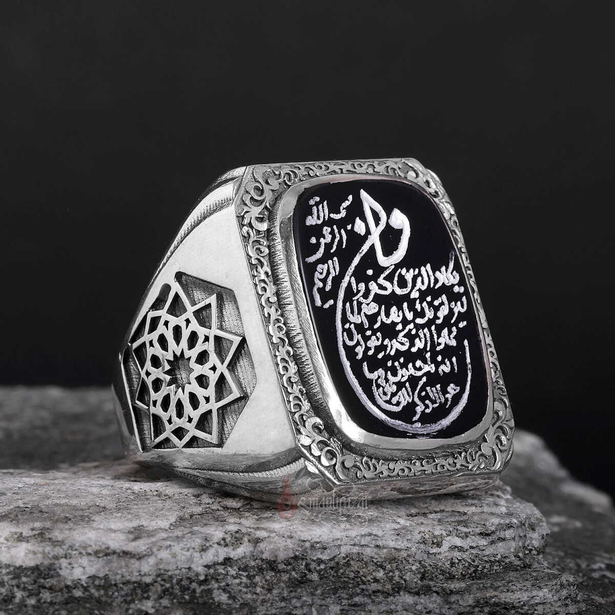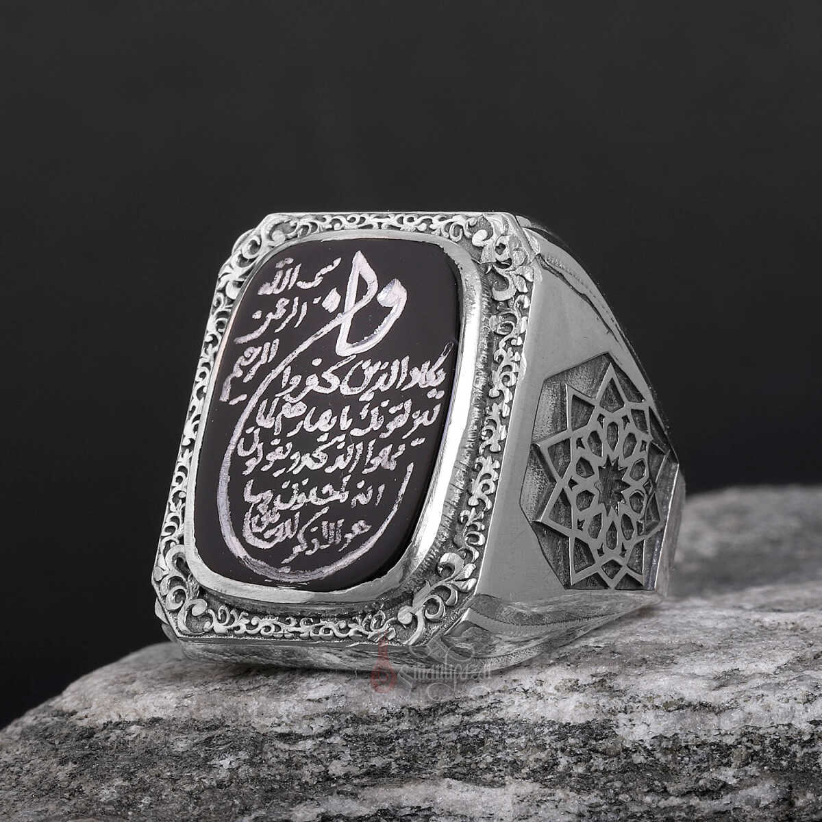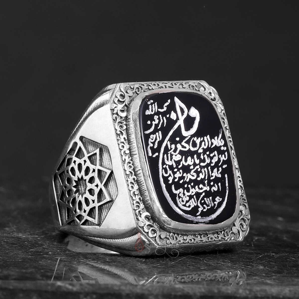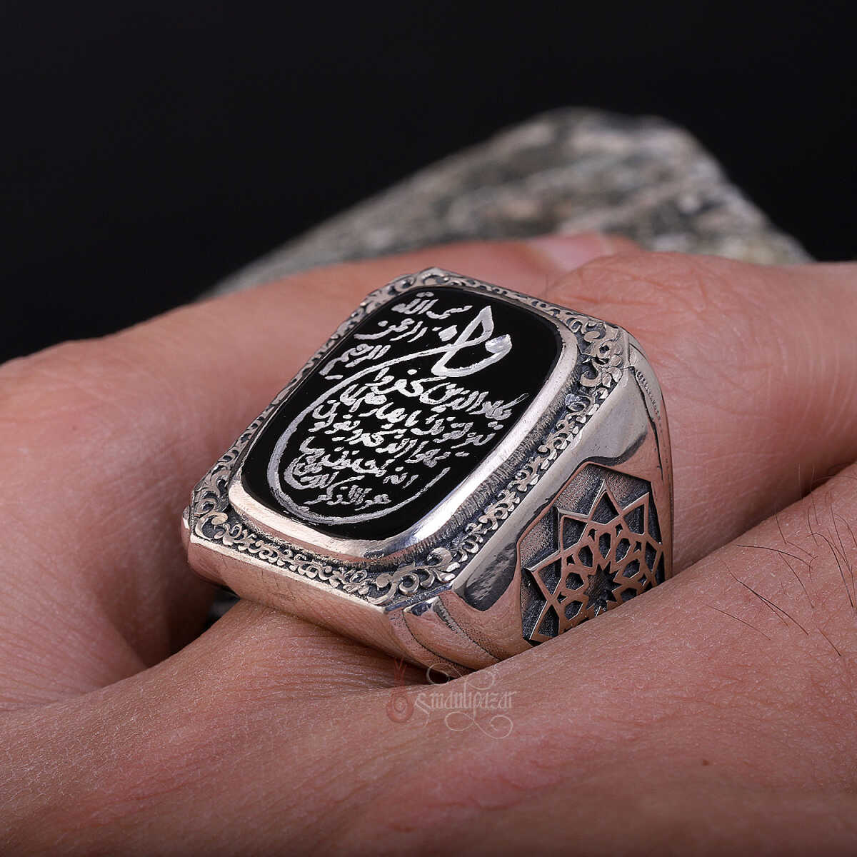 Bu eşsiz tasarımda; Kur’an-ı Kerim’de nazar ve kötü enerjilere karşı okunan en güçlü ayetlerden biri olan Nazar Ayeti, siyah akik taş üzerine özenle yazılmıştır. Yüzüğün kenarlarında yer alan Erzurum kalem işçiliği ve klasik Osmanlı motifleri, manevi korumayı sanatsal zarafetle buluşturur.