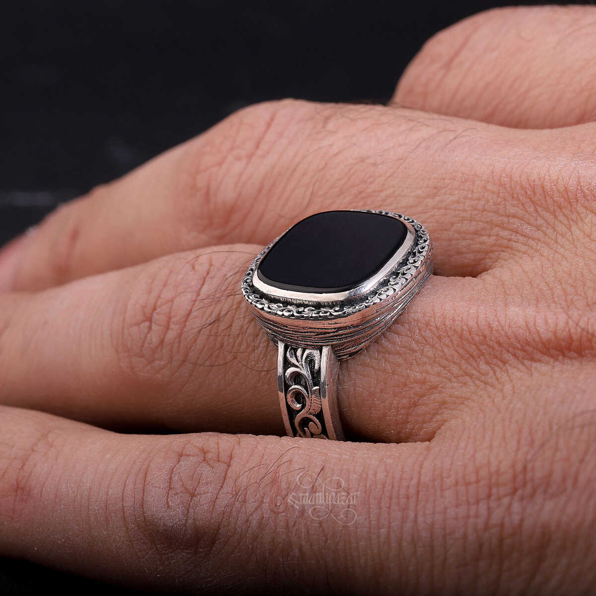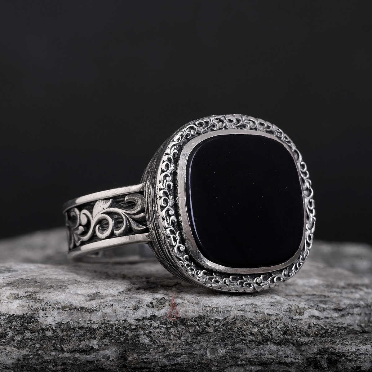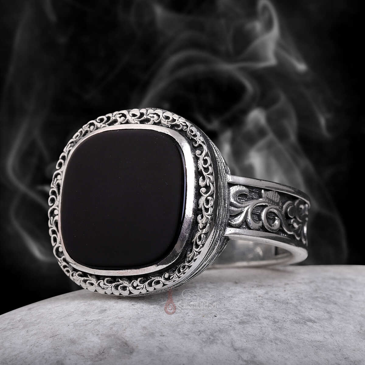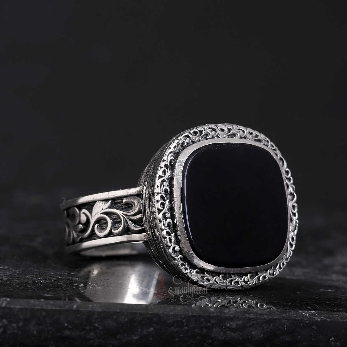 Doğal siyah oniks taşı ile hazırlanmış bu özel yüzük, geleneksel Erzurum kalem işçiliği ile detaylandırılmıştır. %100 925 ayar gümüşten üretilen yüzük, hem enerjisel faydaları hem de sanatsal estetiğiyle dikkat çeker.
