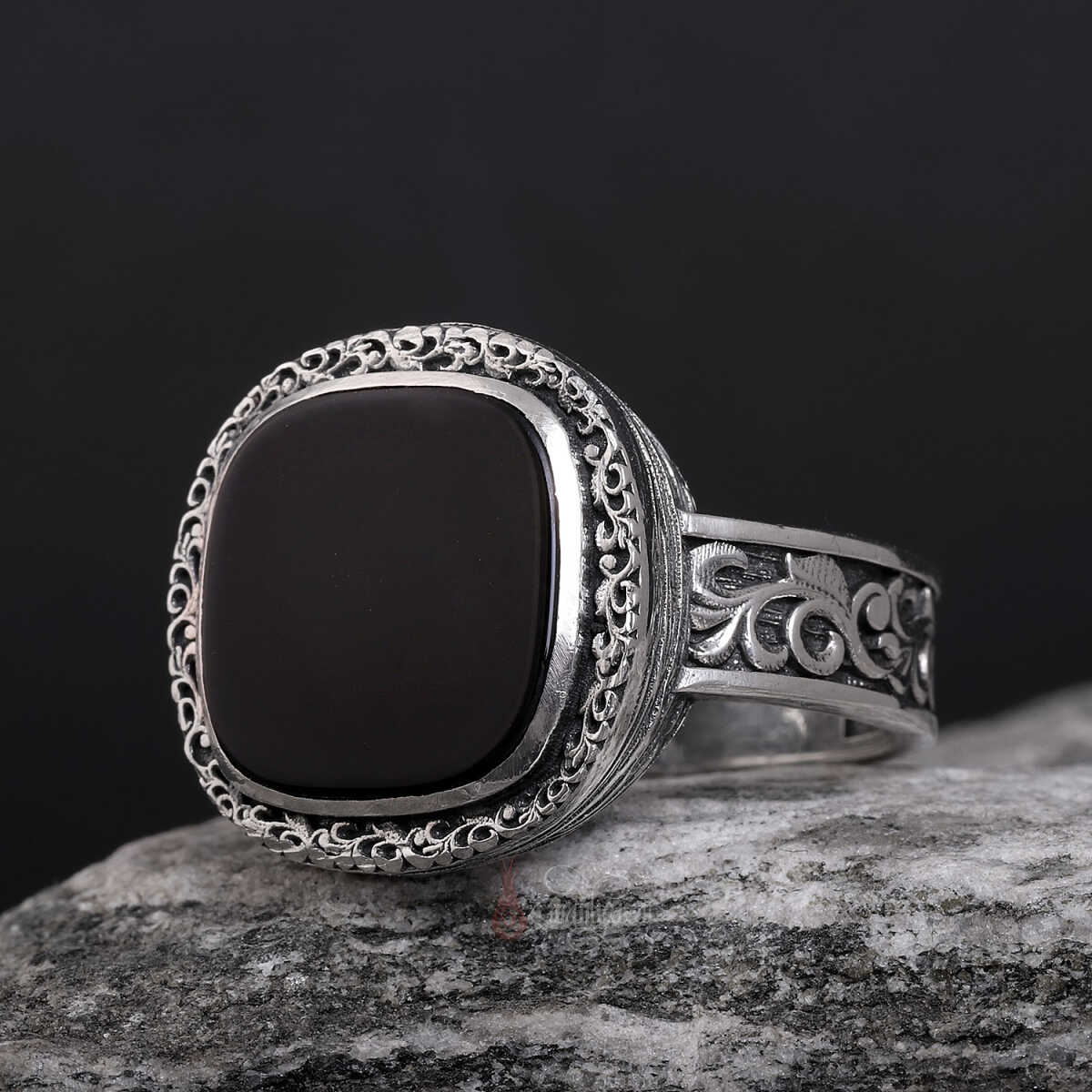Siyah Oniks Taşı Erzurum Kalem İşçiliği 925 Ayar Gümüş Yüzük